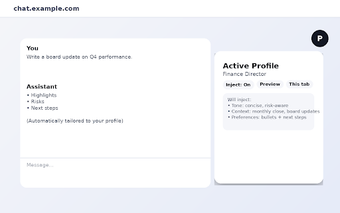 Profile Context Injector est une extension gratuite pour Chrome qui permet aux utilisateurs de gérer plusieurs profils pour des interactions avec des outils de chat basés sur des modèles de langage. Cette fonctionnalité permet de basculer entre différents contextes, comme celui d'un directeur financier ou d'un parent, afin d'adapter les réponses selon le ton et les objectifs souhaités. L'extension injecte automatiquement le contexte et la mémoire du profil sélectionné dans chaque prompt, garantissant ainsi des réponses cohérentes et personnalisées.